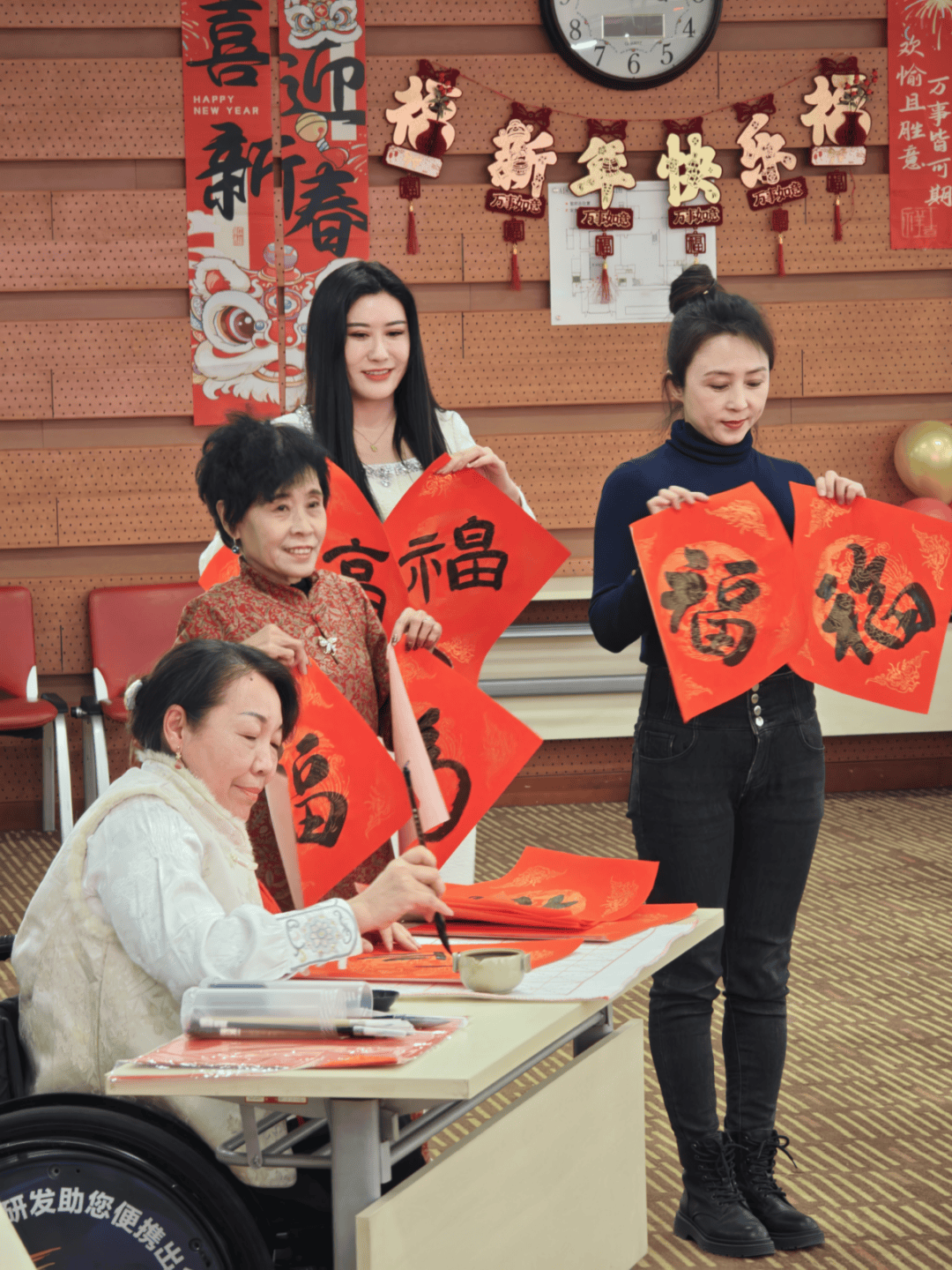 活动中,肢残书法家挥毫泼墨,一张张红底金纹的“福”字跃然纸上。这些满载祝福的福字被送至每位来宾手中,将现场温馨氛围推向高潮。