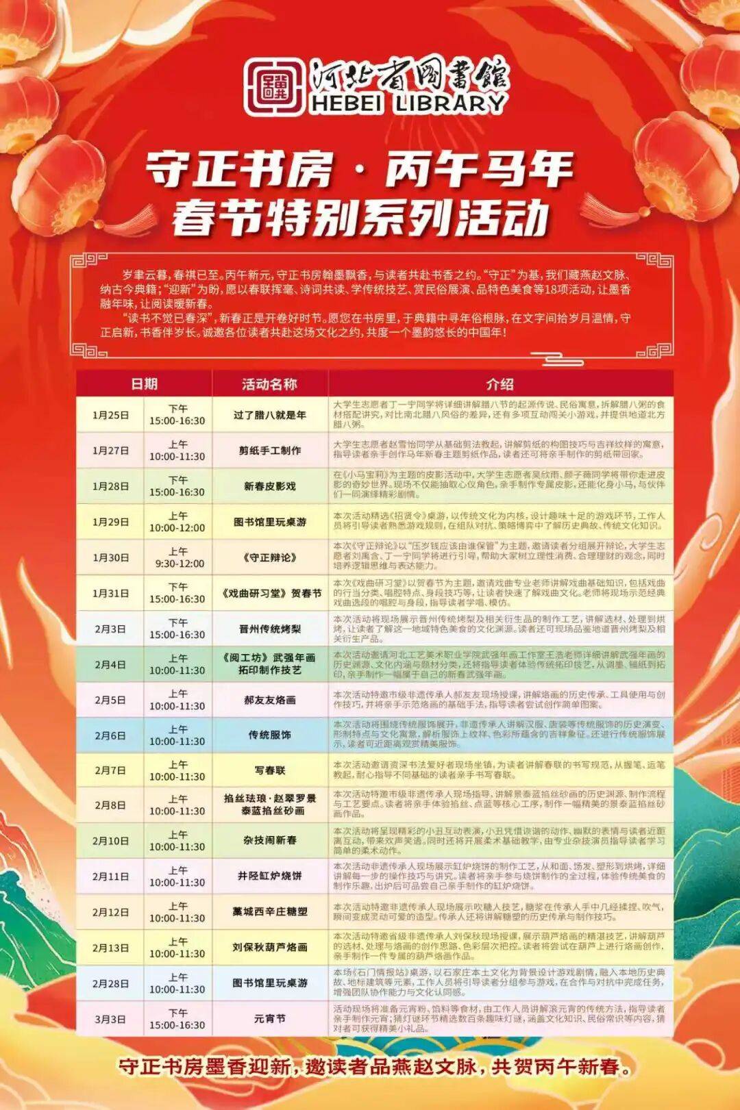这个寒假,河北省图书馆守正书房还将持续推出更多优质的丙午马年新春系列活动,以读者喜闻乐见的形式活化传统文化,用书香浸润时光、用陪伴温暖冬日。让我们共同期待后续精彩,在笔墨书香与民俗雅趣中,一同酿造浓浓的年味,共度一个有温度、有文化的新春佳节!