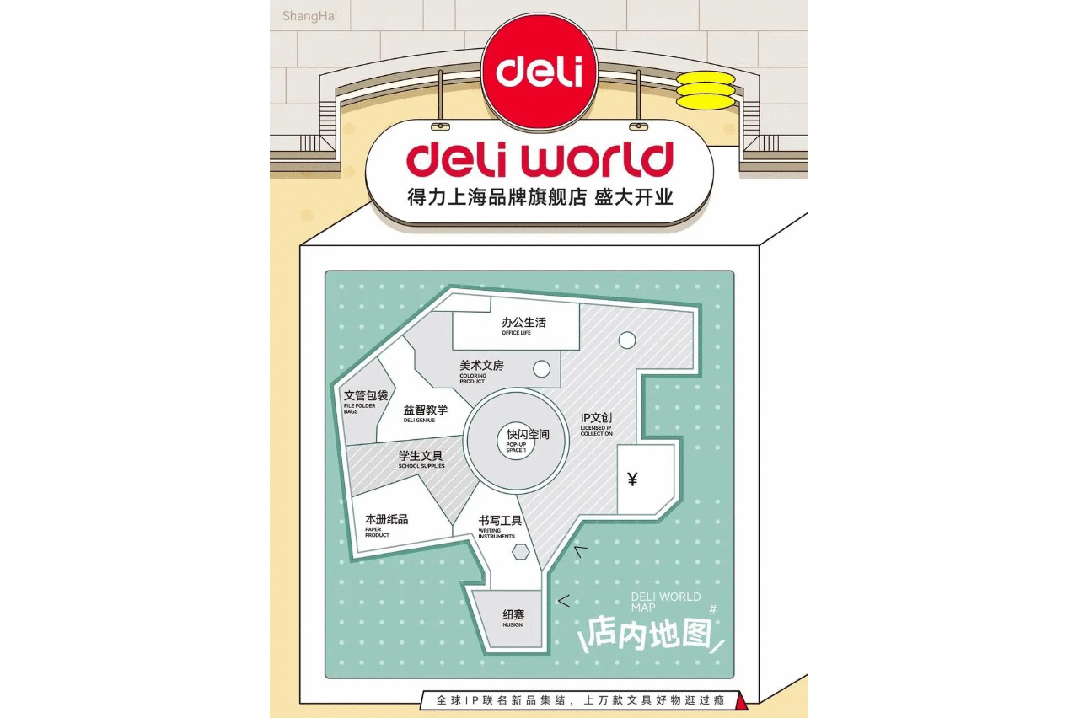 如果说超级文具节是得力打造的限定狂欢,那么其线下渠道的整体重塑,则为这种狂欢提供了常态化的底气。一个标志性的信号是,2025年得力上海品牌旗舰店Deli World在上海静安大悦城重磅落地,这是一座面积达1500平方米的“中国最大文具综合体”。